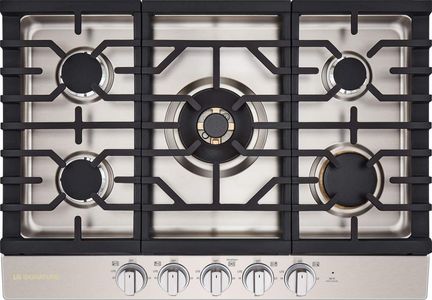 Embrace your affinity for pro-style design and take it all in, from the heavy duty cast iron grates to LED backlit metal knobs. With one turn, you’ll quickly discover this powerful gas cooktop does more than turn heads. The 24k UltraHeat™ center burner has all the heat you need to bring the sizzle yet can instantly drop to a gentle simmer. A total of 5 sealed gas burners including 2 in premium solid brass gives you the flexibility to streamline dinner prep like a pro.Read More